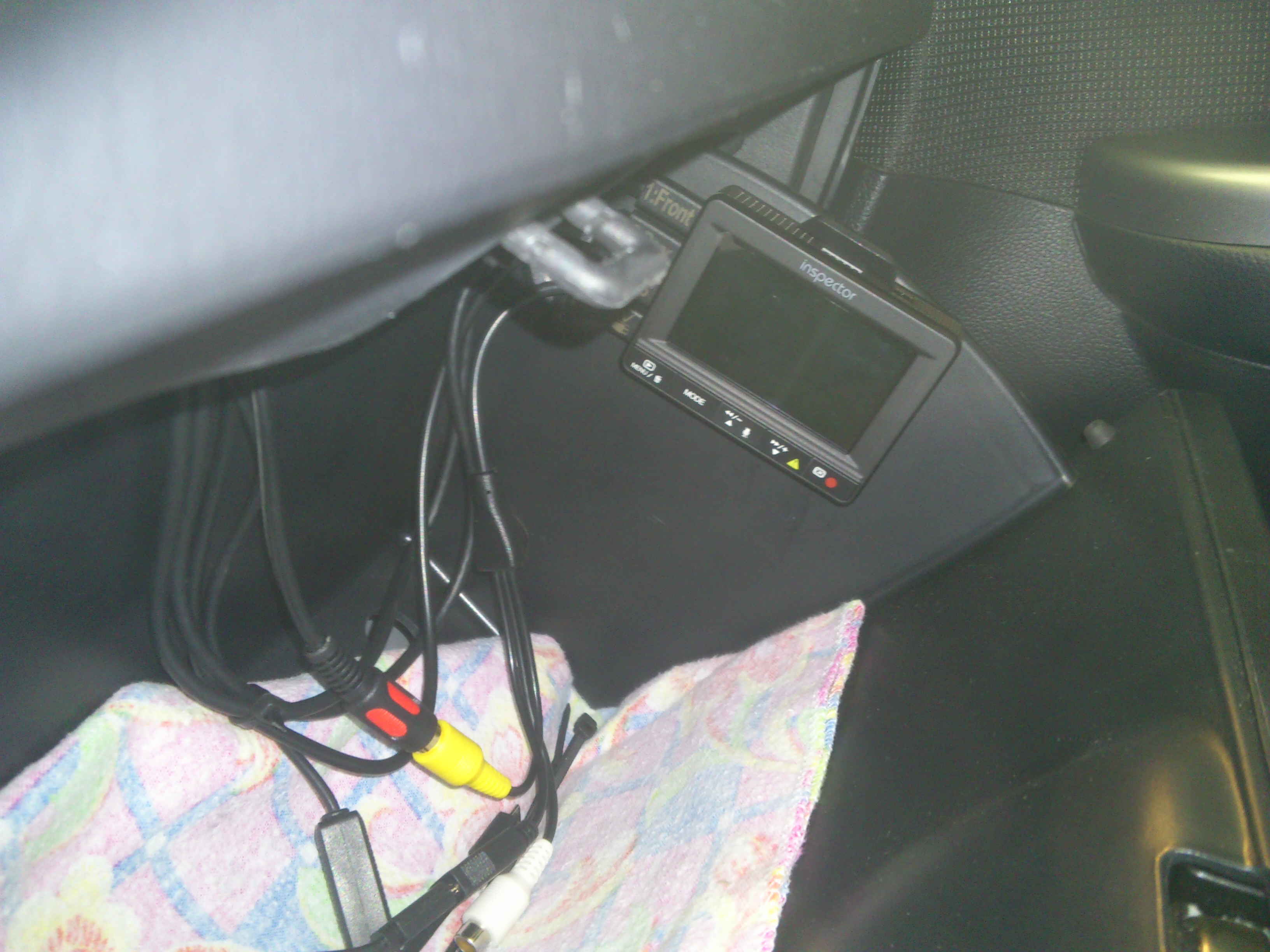 7. Сам блок маленький, а проводов в него приходит куча. В бардачке теперь вечная паутина, выглядит некрасиво и на постоянку непонятно как устанавливать, провода ведь все-равно будут болтаться и путаться. GPS и экстренная кнопка подключаются через коротенький проводок-хаб, лучше бы на этот хаб приходили бы камеры тоже и тогда в сам главный блок шло бы уже 2 провода (1 - питание, 2 - gps,кнопка, камеры) вместо 4 как сейчас.