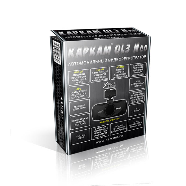 Видеорегистратор Каркам Ql3 Neo Особенности: - Новый мощный процессор Ambarella A5S30 - Новый сенсор APTINA AR0330 с высокой светочувствительностью - Съемный круговой поляризационный фильтр, который устраняет блики и отражения от лобового стекла (эффект "Антиблик") - Новый 5-ти элементный объектив 140град с большой светосилой с ИК напылением - Возможность ручной регулировки экспозиции во время записи “горячей кнопкой” [EV]. - Встроенная память 1GB. При резервном копировании может поместиться до 5-ти видеороликов. - Функция ZOOMирования в режиме записи - 2,7'’ TFT LCD Дисплей - Детектор движения - Съемный поворотный кронштейн с разъемом питания. - 4-х метровый шнур адаптера питания. Позволяет осуществить скрытую проводку под обшивкой салона автомобиля - Защита файлов от затирания “горячей кнопкой” - Настраиваемый G-сенсор (Защита файлов от перезаписи при столкновении, ударе...). - GPS модуль (запись скорости и координат) - Отключение записи звука “горячей кнопкой” во время записи - Штамп даты/времени и госномера вашего автомобиля По факту, тот же Каркам Ql3 Eco + GPS