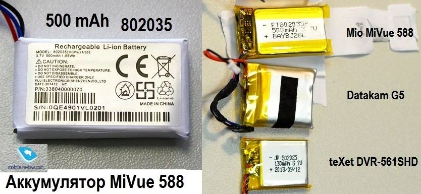 Надписи при включении - скорее всего экранная заставка при включении, перед открытием режима входа в меню: http://megaobzor.com/review-mio-mivue-588.html Все вроде указывает на необходимость замены аккумулятора, зарядка ему уже не помогает, а в цепь питания ВР аккумулятор подключается не как в автомобиле, не "прикуришь". Поскольку производитель нигде не указывает, какой аккум установлен в устройстве, пришлось поискать в сети: http://www.mobile-review.com/articles/2015/datakam-g5.shtml и еще По подбору аккумуляторов и чем заменить акум с контроллером можете заглянуть в тему по Электрике http://videoregforum.ru/threads/ehl...-razemov-istochniki-pitanija-izmerenija.1048/
