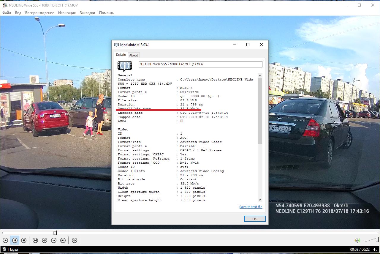 А что по "железу"? По Mediainfo - Ambarella, по приложенному к обзору ролику: битрейт переменный, 18,0 Мбит/сек, 1920 х 1080, 16:9, режим частоты кадров: постоянный, частота кадров: 29,970. Цена сейчас на него 7000 р. Спойлер: скрины с ролика в обзоре Спойлер Данные Mediainfo Общее Полное имя : C:\Users\Neoline S55 Wide День Уфа.MOV Формат : MPEG-4 Профиль формата : QuickTime Идентификатор кодека : qt 0000.00 (qt ) Размер файла : 400 Мбайт Продолжительность : 3 м. 0 с. Режим общего битрейта : Переменный Общий поток : 18,6 Мбит/сек Дата кодирования : UTC 2017-10-18 06:51:14 Дата пометки : UTC 2017-10-18 06:51:14 AMBA : Видео Идентификатор : 1 Формат : AVC Формат/Информация : Advanced Video Codec Профиль формата : Main@L4 Настройки формата : CABAC / 1 Ref Frames Параметр CABAC формата : Да Параметр RefFrames формата : 1 кадр Параметр GOP формата : M=1, N=15 Идентификатор кодека : avc1 Идентификатор кодека/Информация : Advanced Video Coding Продолжительность : 3 м. 0 с. Вид битрейта : Переменный Битрейт : 18,0 Мбит/сек Ширина : 1920 пикселей Width_CleanAperture/String : 1920 пикселей Высота : 1080 пикселей Height_CleanAperture/String : 1080 пикселей Соотношение сторон : 16:9 Режим частоты кадров : Постоянный Частота кадров : 29,970 (30000/1001) кадров/сек Цветовое пространство : YUV Субдискретизация насыщенности : 4:2:0 Битовая глубина : 8 бит Тип развёртки : Прогрессивная Бит/(Пиксели*Кадры) : 0.290 Размер потока : 385 Мбайт (96%) Заголовок : Ambarella AVC / Ambarella AVC Язык : English Дата кодирования : UTC 2017-10-18 06:51:14 Дата пометки : UTC 2017-10-18 06:51:14 Цветовой диапазон : Full Аудио Идентификатор : 2 Формат : AAC Формат/Информация : Advanced Audio Codec Профиль формата : LC Идентификатор кодека : mp4a-40-2 Продолжительность : 3 м. 0 с. Вид битрейта : Постоянный Битрейт : 64,0 Кбит/сек Номинальный битрейт : 128 Кбит/сек Каналы : 1 канал Расположение каналов : Front: C Частота : 48,0 КГц Частота кадров : 46,875 кадров/сек (1024 SPF) Метод сжатия : С потерями Размер потока : 1,37 Мбайт (0%) Заголовок : Ambarella AAC / Ambarella AAC Язык : English Дата кодирования : UTC 2017-10-18 06:51:14 Дата пометки : UTC 2017-10-18 06:51:14 Текст Идентификатор : 3 Формат : Timed Text Идентификатор кодека : text Продолжительность : 3 м. 0 с. Продолжительность оригинала : 2 м. 59 с. Вид битрейта : Переменный Размер потока оригинала : 13,6 Кбайт (0%) Заголовок : Ambarella EXT / Ambarella EXT Язык : English Forced : Нет Дата кодирования : UTC 2017-10-18 06:51:14 Дата пометки : UTC 2017-10-18 06:51:14