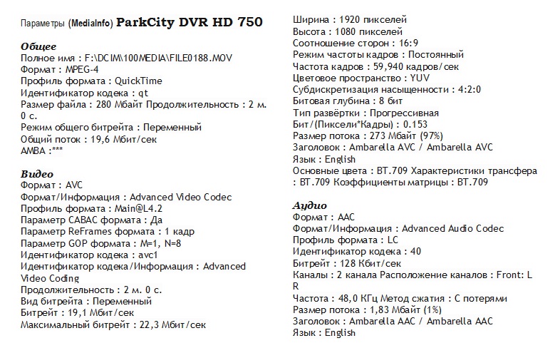Новинка представлена компанией АВТОДЕН http://www.autoden.ru/catalog/185/3380/. Инструкция по обновлению прошивки Основные особенности, характеристики, спецификация: Процессор Ambarella A7 Матрица - 1/3" CMOS, 4 Мп Обьектив - стеклянные линзы, светосила f/2.0 Угол обзора (диагональ) - 175° Максимальное разрешение записи 1920x1080 @ 60 кадров/сек, настройки: 1092х1080 /30 к/сек, 1280х720 /60 к/сек, 1280х720 /30 к/сек Формат видеозаписи MP4 (MPEG-4, файл .MOV) Битрейт - переменный, 19 Мбит/сек Дисплей - 3,0" Интерфейсы - miniUSB 2.0, HDMI, AV-out Карты памяти - micro SDHC (до 32 Гб/ класс 6 и выше) - наружный слот Внутренняя память - нет Аккумулятор - встроенный, Li-Ion, 240 мАч Рабочая температура 0°С / +60°С Параметры видео/аудио (MediaInfo) видеорегистратора ParkCity DVR HD 750 Кронштейн: сразу обращает на себя внимание его компактность: присоска диаметром всего 50 мм и небольшая общая высота: от верхней кромки присоски до оси обьектива - около 10 см. На фото ниже видно, что ВР практически весь можно "спрятать" за светофильтр на лобовом стекле (возможность более высокого расположения еще и очень положительно сказывается на общем обзоре). Питание - через кронштейн, разьем на самом видеорегистраторе показался надежным, устанавливать-снимать удобно, защелка разблокируется без особых усилий. Через адаптер гнезда прикуривателя подается 5В на кронштейн, имеется встроенный аккумулятор, которого в режиме записи на максимальных настройках хватает на автономную работу в течение 15-16 мин. Кнопки управления - 5 шт, расположены снизу, крайняя левая - активация аварийной записи/защищенного файла. Защищенные файлы сохраняет в ту же папку, что и основные, но с наименованием EVEN. Кнопка Power расположена отдельно - справа сверху. Два светодиода слева от дисплея: верхний (голубой) - мигает при записи, нижний (красный) - светится, когда подключено внешнее питание и разряжена батарея (в процессе зарядки, потом отключается). Инструкция довольно подробная, но мелкого масшаба, читать удобнее скан на экране компьютера. Двухминутный ролик в качестве 1920x1080 (60 к/с) (настройки по дефолту) занимает обьем около 300 МБ, карты в 32ГБ при 60 fps "хватает" для записи 3ч 20 мин. ВР принял участие в экстрим-тесте на трофи-рейде, будучи установленным в "боевой" автомобиль. После почти 7 часов непрерывной сьемки (все настройки были установлены "по умолчанию" (экспокоррекция = 0): оригинал http://yadi.sk/d/4kSSmcNpQVgpB оригинал http://yadi.sk/d/q-7YcT1yQVgvM С материалами по экстрим-тесту и участии в нем ВР ParkCity DVR HD 750 можно более подробно ознакомиться здесь: http://videoregforum.ru/threads/ehkstrim-test-videoregistratorov-24-chasa-bezdorozhja.1220/ Видео, снятое видеорегистратором ParkCity DVR HD 750 в обычном автомобиле при движении по обычному шоссе: солнечно, день, туннель оригинал http://yadi.sk/d/q2TRb4lRQdk7Y солнечно, день, против солнца оригинал http://yadi.sk/d/Q1xxlt8PQdkhe К сожалению, не удалось проверить ВР на различных настройках (некоторый засвет картинки при дефолтных настройках днем все же есть), а на ролики ночного видео в экстрим-тесте наложились более поздние, т.к. сьемка производилась в режиме нонстоп в течение почти 24 часов соревнований (с совсем небольшим перерывом на отдых). Новинка компании в скором времени примет участие в летнем тесте ВР-форума.