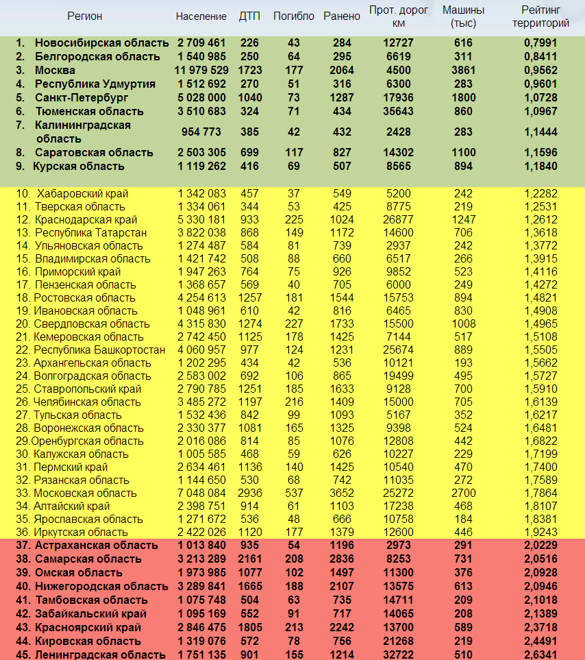 Первые двенадцать позиций рейтинга занимают регионы с удовлетворительной дорожной безопасностью, получившие рейтинг территории до единицы включительно (зелёная зона). Новосибирская область сместила Тюменскую с первой позиции рейтинга на шестую, а второе и третье места поделили Белгородская область и Москва. Первый регион продемонстрировал эффективную работу ЖКХ и качественную сезонную уборку дорог, Белгородчина же обязана хорошими показателями местной Госавтоинспекции – в сильные снегопады личный состав ГИБДД переводился на усиленный вариант несения службы и обеспечивал необходимый уровень дорожной безопасности. В Москве основная доля ДТП приходится на два столичных кольца – ТТК и МКАД, а среди вылетных магистралей самым аварийным признан Ленинградский проспект.