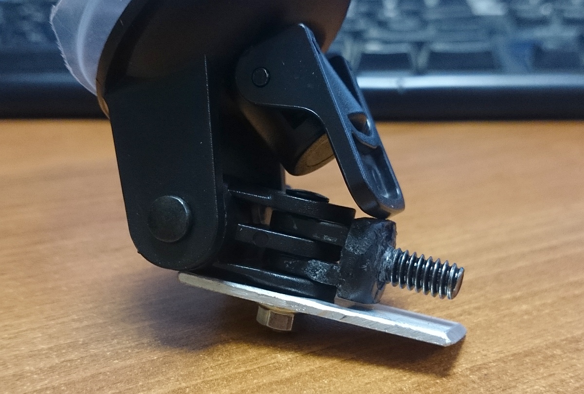 Ещё вариант жёсткого крепления с более коротким "плечом": Правда, присоска на первом фото развёрнута не в ту сторону...) Шпильку с резбой можно отпилить, но мало ли пригодится для других экспериментов... Видео с первым вариантом крепления - просёлочная дорога: https://yadi.sk/d/Jh3s4tvkUNvDu Второй вариант (с фото) - город-брусчатка: https://yadi.sk/i/LCIWU52AYmaUw С родным креплением на брусчатке сплошная дискотека, проверено. Кстати, вот видео видео с родным креплением: https://yadi.sk/i/ojj5lrJ5Ymfoq